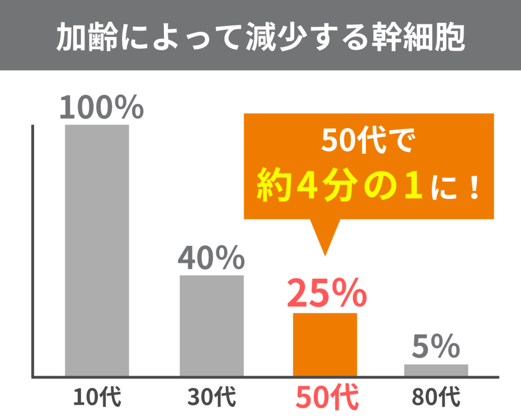 これは幹細胞の「数」自体が減ったというのもありますが、1つ1つの幹細胞の「質」、つまり「変身能力」も衰えているからです。